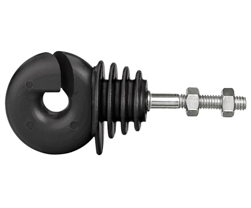 Kroužkový izolátor se šroubem M6 s 2 matkami pro pevné ohrady a všechny vodiče do 3 mm; používá se obvykle na kovové sloupky. Délka závitu 23 mm.