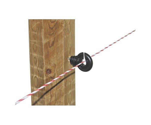 Izolátor vhodný pro připevnění drátu nebo lanka do průměru 4 mm a pásky do šíře 10 mm ke kůlu elektrického ohradníku.