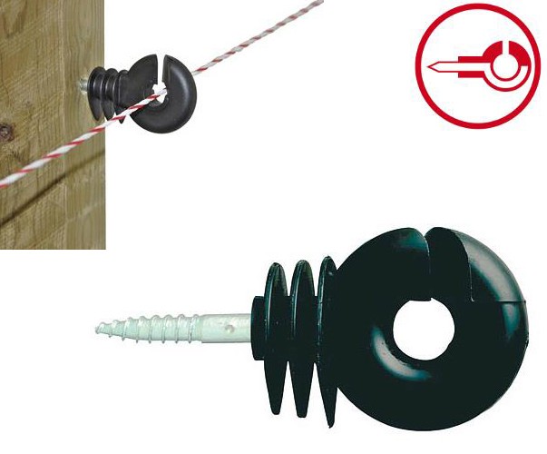 Kruhový izolátor pro el. ohradníky s vrutem, procházejícím celým tělem izolátoru. Vrut o průměru 6 mm zajišťuje vysokou stabilitu ukotvení. Izolátor by měl být v kůlu zašroubován celou plochou vrutu až po plastovou část. Pokud tak neučiníte, zapříčiníte zvýšené namáhání izolátoru. K montáži použijte montážní hlavice pro akuvrtačky. Vzhlem ke své konstrukci, může z důvodu různé tepelné roztažnosti plastu a kovu, docházet k mikroplasklinám. To může způsobovat probíjení do podložky. Je třeba uvedený jev kontrolovat.