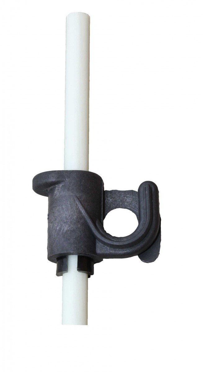 Plastový izolátor, který je vhodný pro všechny vodiče a pásky na sklolaminátové tyčky. Pro upevnění k laminétové tyčce je potřeba kleština.