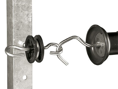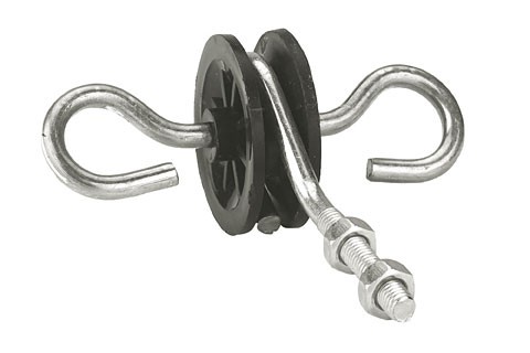 Vchodový/koncový izolátor s pozinkovaným šroubem s metrickým závitem a 2 vodivými očky pro zakončení vodiče a napojení bránové rukojeti na kůlech vchodu ohrady. Délka závitu M6 je 35mm.