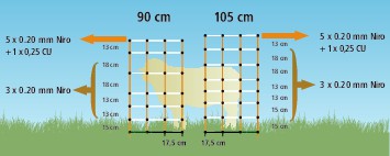 Vodivá síť pro elektrický ohradník určená pro ovce (výška 90cm) a kozy (výška 105cm). Sítě o výšce 90cm mají 7 vodorovných řad lanka, 14 kolíků s jednoduchým nebo dvojitým hrotem. Sítě o výšce 105cm mají 8 vodorovných řad lanka, 14 kolíků s jednoduchým nebo dvojitým hrotem. Sítě osazené kolíky s dvojitým hrotem jsou stabilnější a lépe se zapichují, dvojitý hrot je jako nášlapka. Síť je zakončena spojovacími klipy pro napojení s další sítí. Vodiče v nejvyšší řadě 1 x 0,25 Cu a 5 x 0,20 INOX, vodiče ve zbylých řadách 3 x 0,20 INOX. Tak aby byl ohradník funkční a kompletní, potřebujete následující komponenty: • zdroj elektrického ohradníku • zemnící kolík • propojovací materiál - kabel s VN izolací, klemu propojovací