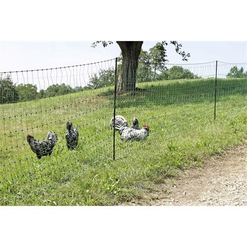 Síť pro slepice, husy, krůty. Svařované uzly. Zesílené horní lanko. Zvláště malá šířka ok ve spodní části sítě. Pevné plastové sloupky s pozinkovaným zemním hrotem. Vhodné také pro jehňata.