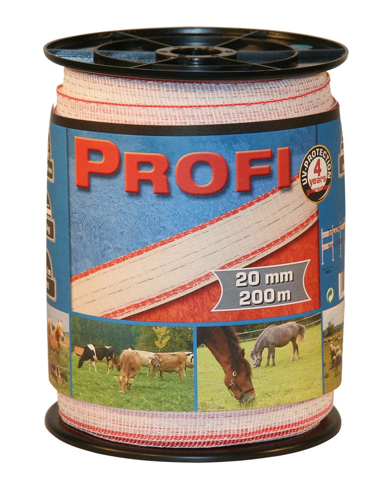 Velmi kvalitní 2 cm páska s dobrou odolností na UV záření, jež je vhodná pro stavbu dlouhých elektrických ohradníků pro koně a která má velmi dobrou vodivost a záruku 4 roky. Obsahuje 6x0,30mm vodičů TriCOND s měrným odporem 0,31 Ohm/m a je doporučena pro délku min. 6km. Pevnost v tahu má 120kp a prodejní cena je za balení 200m.