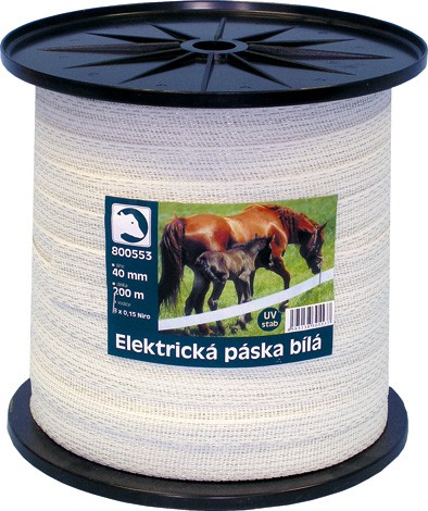 Klasická vodivá páska pro kratší elektrické ohrady vhodná pro koně; páska obsahuje 8x0,15mm Niro vodiče s měrným odporem 3,8 Ohm/m, je průměrně vodivá a má průměrnou pevnost v tahu - 130kp. Prodejní cena je za balení 200m.