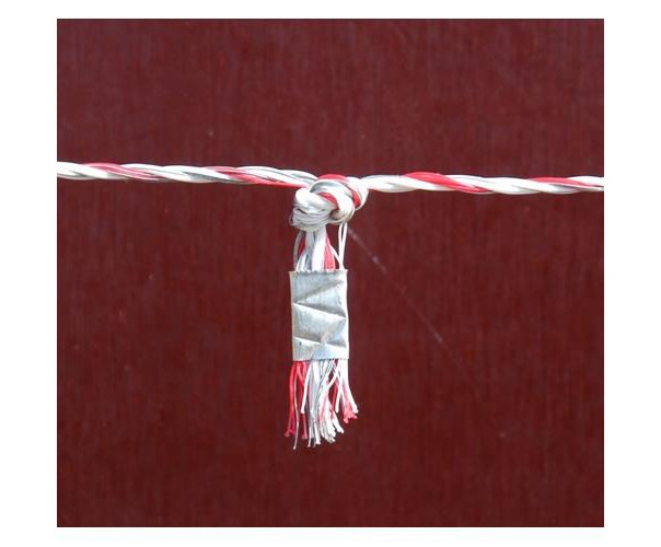 Spojka na lanko pro elektrických ohradníků. Vodivá měděná pocínovaná dutinka. Volné konce vodiče elektrického ohradníku za uzlem se provléknou a dutinka se zmačkne kleštěmi.