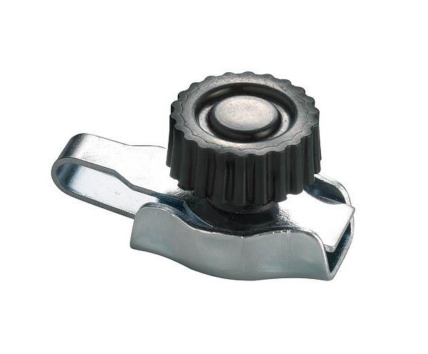 Výlisek z pozinkovaného plechu doplněný tvarovanou podložkou doplněnou háčkem a matkou s plastovým obalem.
