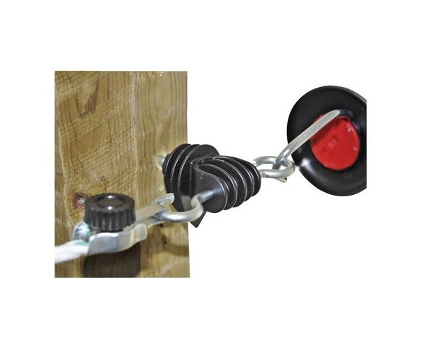 Výlisek z pozinkovaného plechu doplněný tvarovanou podložkou doplněnou háčkem a matkou s plastovým obalem. Použítí při spojování ohradníkových lan nebo při jejich připojení k ručce vchodu. Velmi kvalitní spojka.