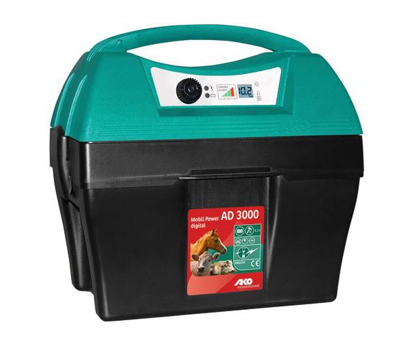 Zdroj energie pro elektrický ohradník je ze sítě 230V, baterie 12 V nebo 9 V (9 V jen u AD 3000), plynulá regulace výkonu, digitální kontrola ohrady a stavu baterie. Baterie, síťový adaptér ani solární panel nejsou součástí dodávky.