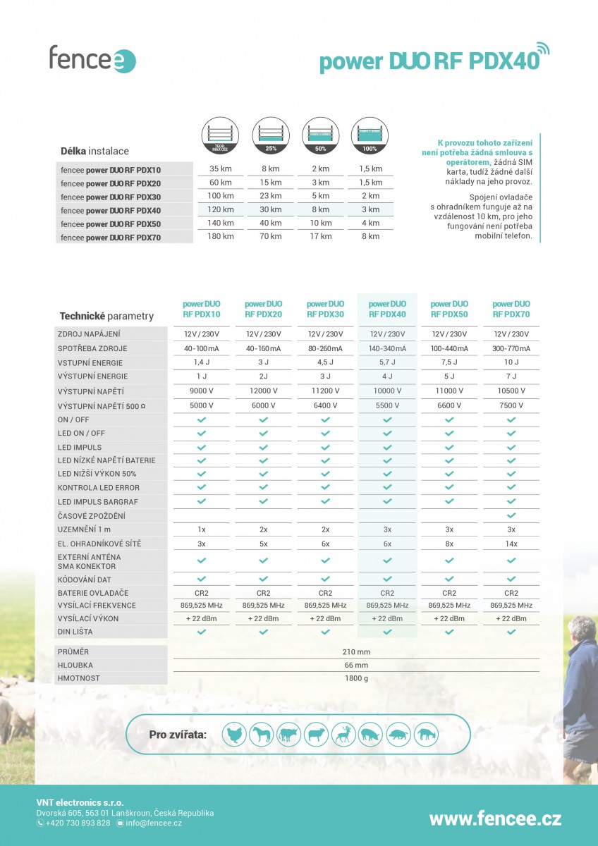 Kombinovaný zdroj pro elektrický ohradník, s dálkovým ovládáním a výstupním výkonem 4 J fencee power DUO RF PDX40 je univerzálně použitelný pro krátké, střední i dlouhé ohrady do 30 km. a vhodný pro citlivější i méně citlivá zvířata jako jsou koně, skot, ovce, koza, drůbež i jako ochrana před zvěří..