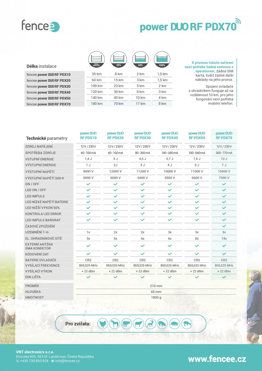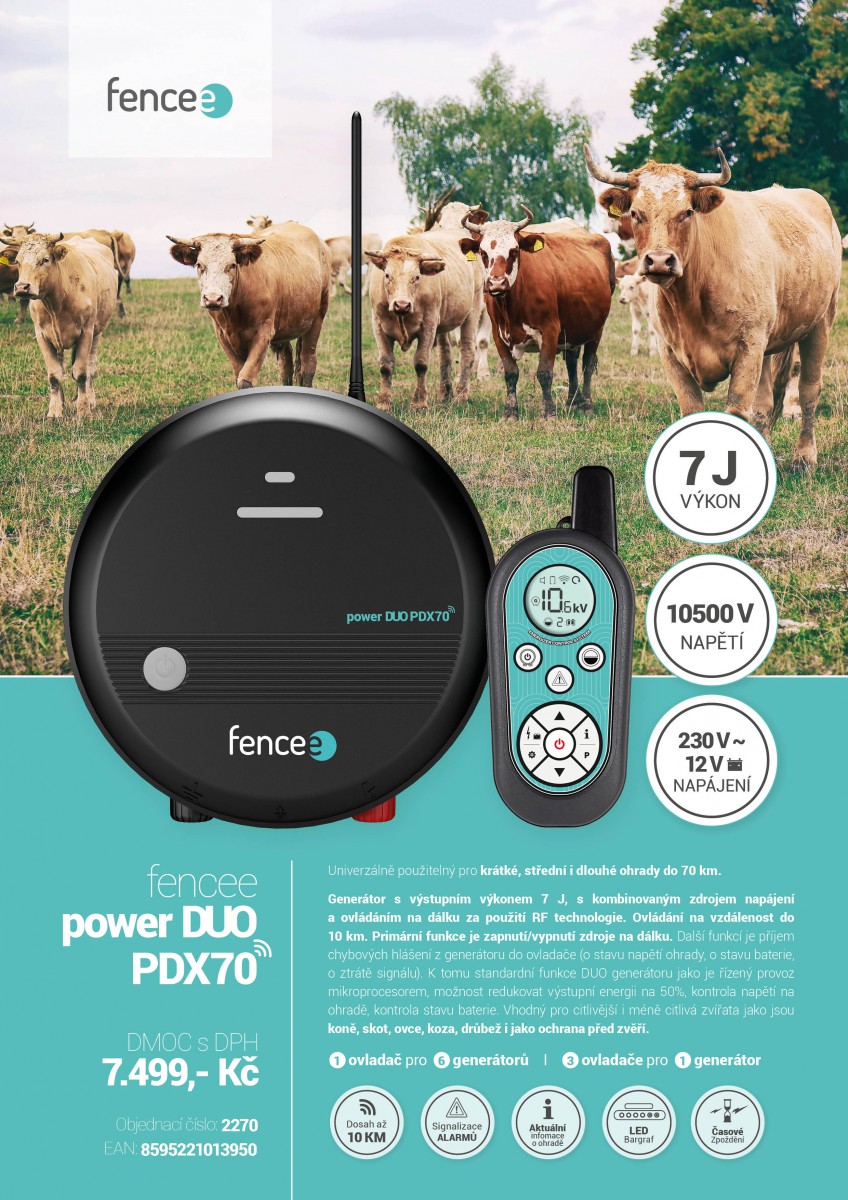 fencee power DUO RF PDX70 je univerzálně použitelný pro krátké, střední i dlouhé ohrady do 70 km a vhodný pro citlivější i méně citlivá zvířata jako jsou koně, skot, ovce, koza, drůbež i jako ochrana před zvěří.