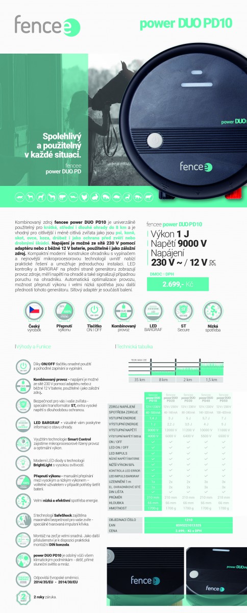 Kombinovaný zdroj fencee power DUO PD10 je univerzálně použitelný pro krátké, střední i dlouhé ohrady do 8 km a je vhodný pro citlivější i méně citlivá zvířata jako jsou koně, skot, ovce, koza, drůbež i jako ochrana před zvěří nebo drobnými škůdci. Napájení je možné ze sítě 230 V pomocí adaptéru nebo z běžné 12 V baterie, použitelné i jako záložní zdroj. Kompaktní moderní konstrukce ohradníku s vypínačem a nejnovější mikroprocesorovou technologií uvnitř nabízí praktické řešení a umožňuje jednoduchou instalaci. LED kontrolky a BARGRAF na přední straně generátoru zobrazují provoz zdroje, měří napětí na ohradě a také signalizují případnou poruchu na ohradníku. Automatická optimalizace provozu, možnost přepnutí výkonu i velmi nízká spotřeba jsou další přednosti tohoto generátoru. Síťový adaptér je součástí balení.