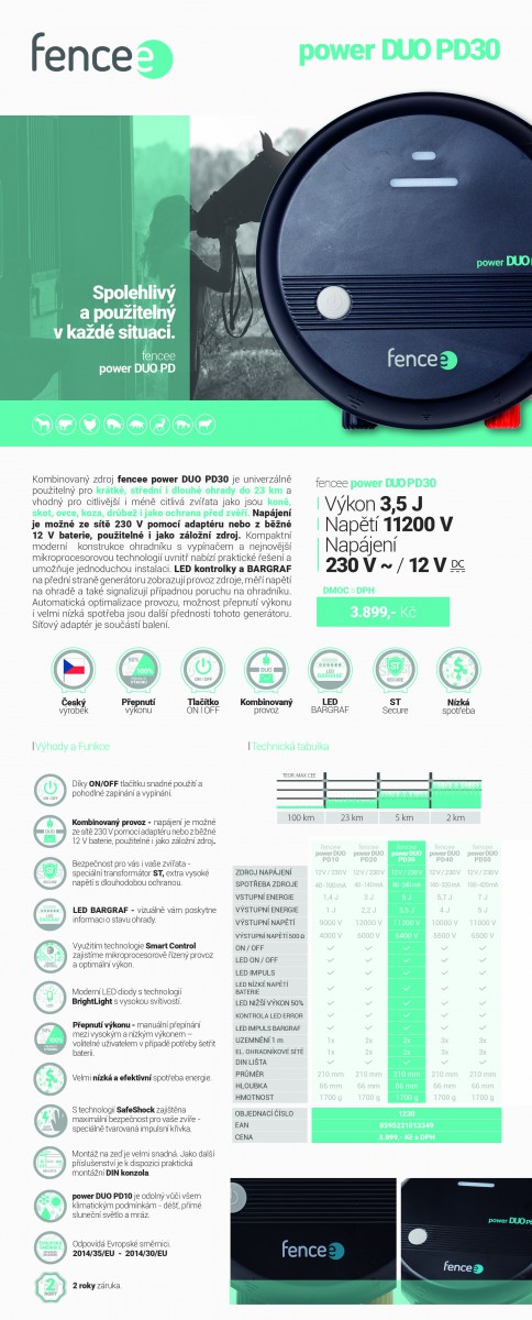 Kombinovaný zdroj fencee power DUO PD30 je univerzálně použitelný pro krátké, střední i dlouhé ohrady do 23 km a vhodný pro citlivější i méně citlivá zvířata jako jsou koně, skot, ovce, koza, drůbež i jako ochrana před zvěří. Napájení je možné ze sítě 230 V pomocí adaptéru nebo z běžné 12 V baterie, použitelné i jako záložní zdroj. Kompaktní moderní konstrukce ohradníku s vypínačem a nejnovější mikroprocesorovou technologií uvnitř nabízí praktické řešení a umožňuje jednoduchou instalaci. LED kontrolky a BARGRAF na přední straně generátoru zobrazují provoz zdroje, měří napětí na ohradě a také signalizují případnou poruchu na ohradníku. Automatická optimalizace provozu, možnost přepnutí výkonu i velmi nízká spotřeba jsou další přednosti tohoto generátoru. Síťový adaptér je součástí balení.