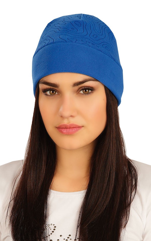 Modrá fleecová čepice s vytlačovaným vzorem.