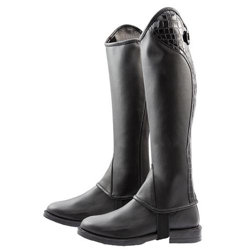 Trendové minichapsy z umělé kůže s částečným vzhledem krokodýlí kůže. Po celé délce elastická vložka pro snadnější zapnutí. Zapínání na zip . Nahoře v zadní čísti zapínání na cvoček. Barva černá.