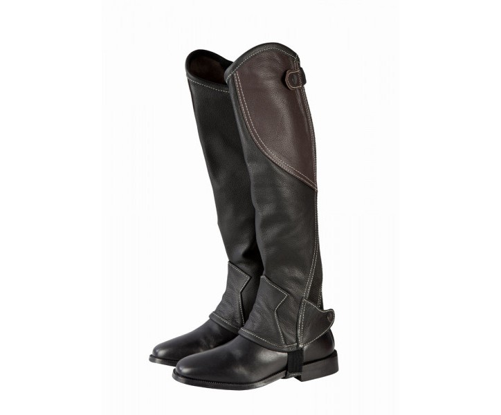 Moderní minichapsy vyrobené z měkké hladké kůže dvou barev. Minichapsy mají na zadní straně gumovou vsadku, zip (zapínání od spodu) a zapínání na cvočky dole a nahoře.