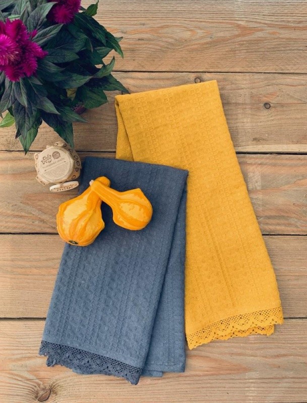 Klasické bavlněné vaflové utěrky v barvách podzimu s ozdobnou krajkou, 2 kusy.