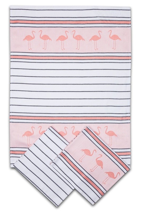 Kuchyňské utěrky s decentním motivem jemných proužků a plameňáků.