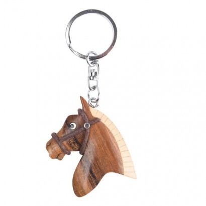 Kovová klíčenka se stylovým dřevěným přívěskem ve tvaru koňské hlavy.