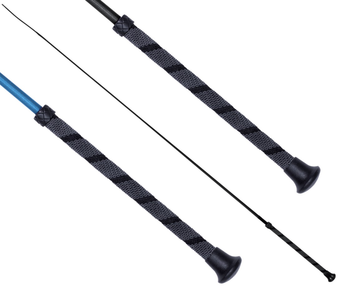 Drezurní bič s protiskluzovou úpravou rukojeti. Bič má laminátové tělo opletené nylonem a antracitově zbarvenou gumovou protiskluzovou rukojeť.