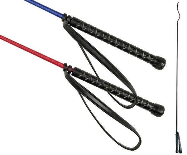 Jezdecký drezurní bič s gumovou rukojetí a poutkem. Jezdecké drezurní biče jsou dlouhé a jejich výhoda tkví ve snadném dosažení za holeň, jejíž pobídky mají zesilovat. Jezdci to dává možnost bič použít s minimálním pohybem rukou, a tedy i s minimálním rušením koně. Vhodné nejen pro drezurní výcvik.