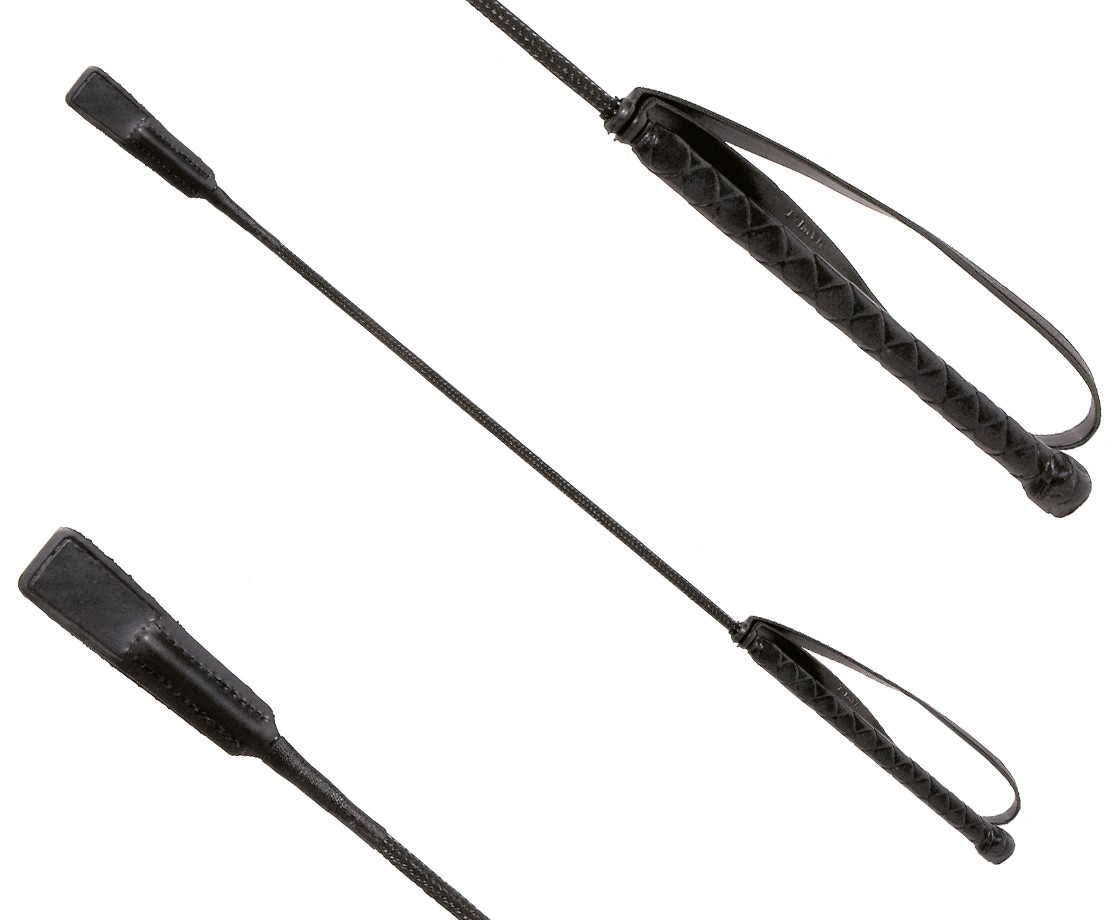 Skokový bičík s pogumovanou rukojetí, poutkem na ruku a úzkou koženou plácačkou.