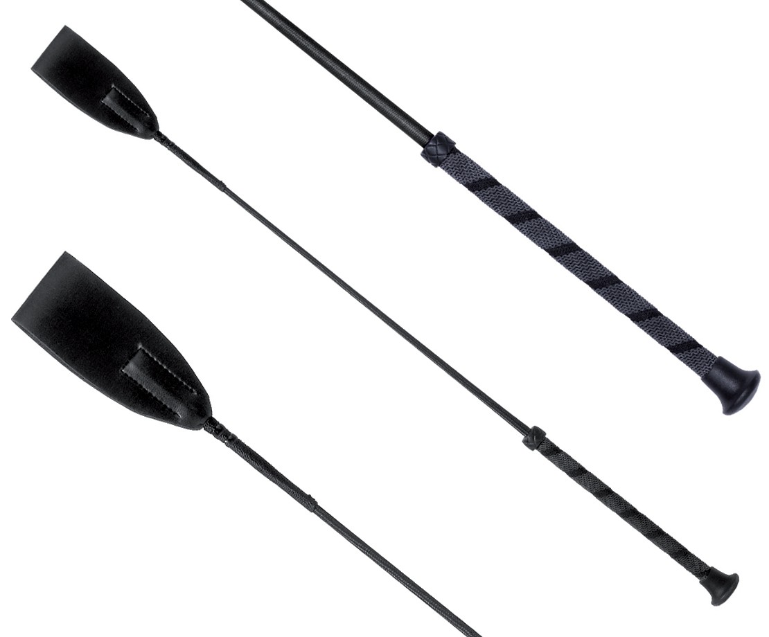 Skokový bičík s protiskluzovou rukojetí a širokou koženou plácačkou.
