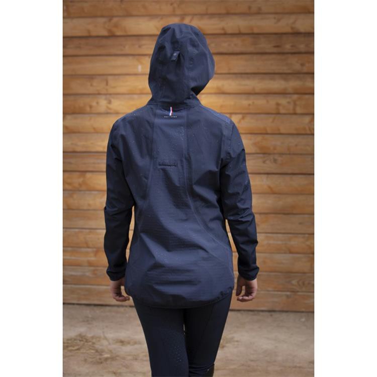 Luxusní nepromokavá dámská bunda značky Equitheme. Bunda je velmi dobře prodyšná, lehká, je možno ji srolovat a zabere tím tak minimum místa. Je větru a vodě odolná, vodní sloupec je 5000 mm. Maximální funkční membrána zajišťuje nepropustnost. Vsadky z elastického polyamidu zajišťují maximální komfort a pohodlí pohybu. Švy jsou taktéž voděodolné. Zakončení rukávů, spodního dílu a kolem kapuce je úzký elastický lem a zabraňuje tak vniknutí studeného vzduchu. Zadní díl je mírně prodloužený. Kapuci je možno upevnit na zadní díl, aby nenarušovala pohodlí během jízdy na koni. Po stranách jsou kapsy na zipy. Bunda má mírně vypasovaný střih a velmi dobře se přizpůsobí na tělo jezdce. Bunda je vhodná na jakýkoliv sport, nejenom na ježdění. Logo Equitheme.