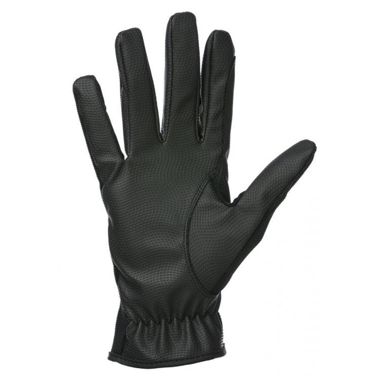 Lehčí jezdecké rukavice značky Equitheme v černé barvě. Zapínání je na suchý zip. Dla=n je vyrobena z umělé jemné kůže a hřbet ruky je z prodyšného materiálu. Logo Equitheme.