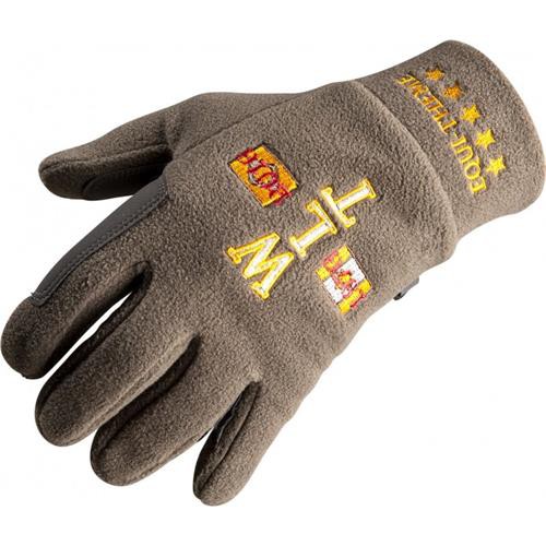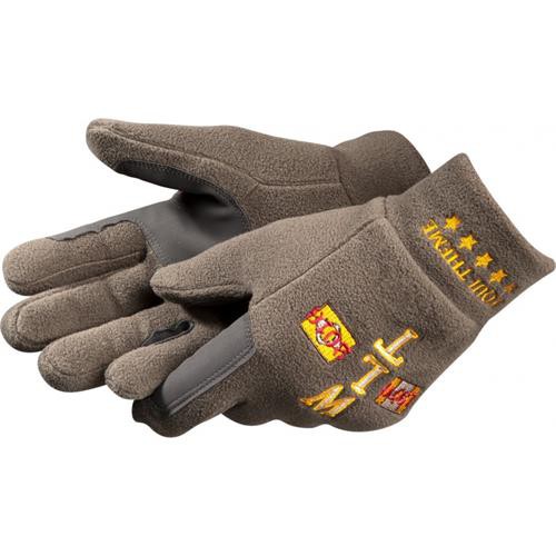 Fleecové rukavice v olivové barvě s kontrastním žlutým logem a potiskem na hřbetě.