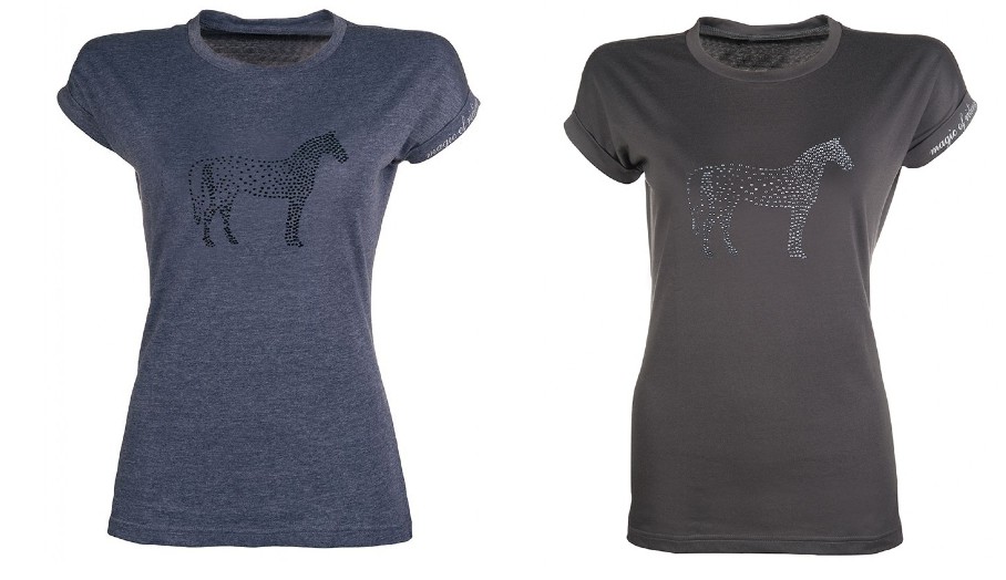 Pohodlné jezdecké tričko zdobené kamínky ve tvaru koně.