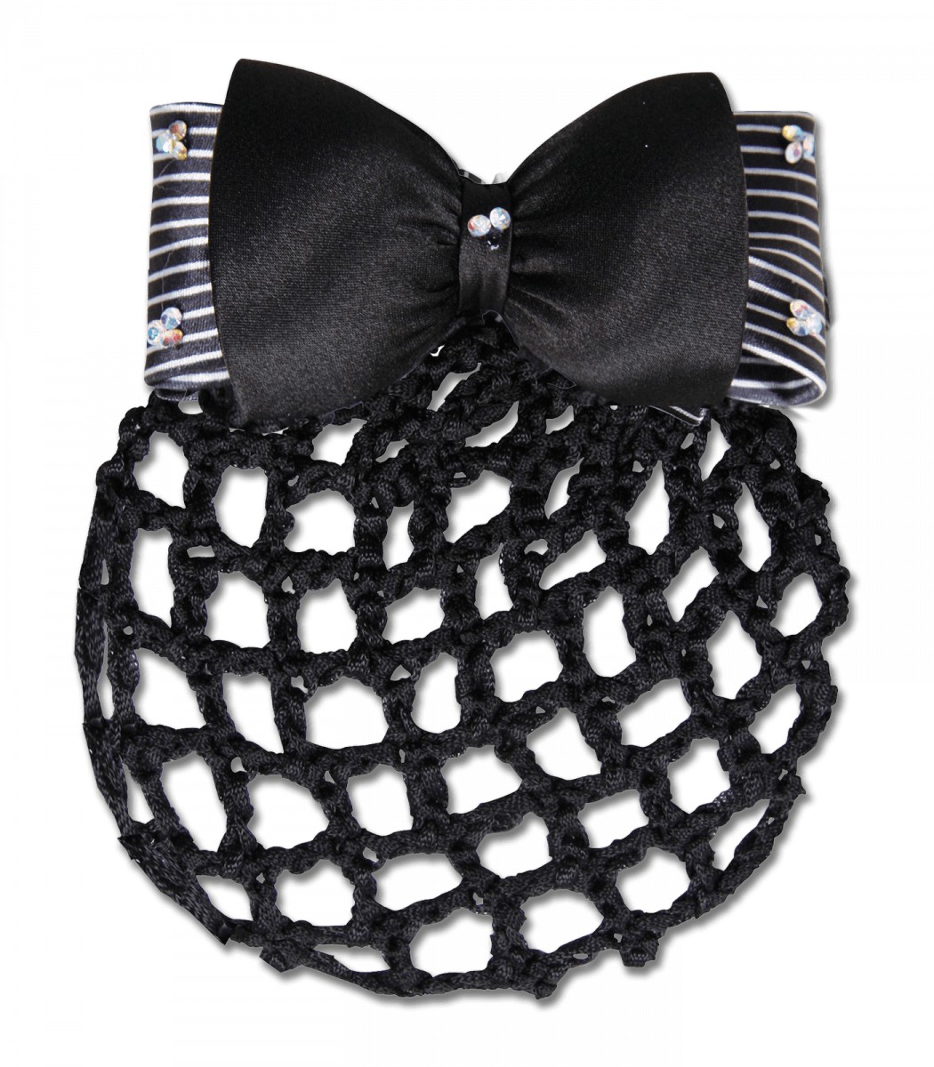 Černá síťka do vlasů osázena syntetickými diamanty spolu se sponou vytváří elegantní účes.