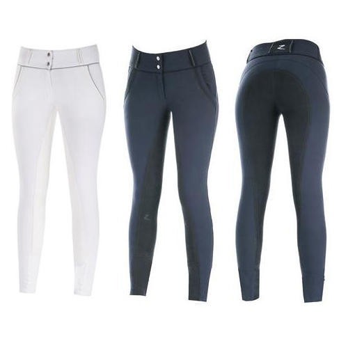 Luxusní dámské rajtky Horze Celine mají plný sed s imitací kůže, díky tomu skvěle přilnou k sedlu a drží sed jezdce.