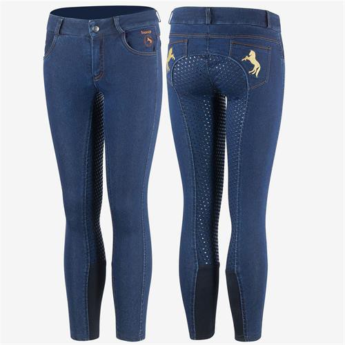Lehké a elastické rajtky značky Horze, které mají celogripový sed ve tvaru srdíček. Vpředu i vzadu jsou po stranách otevřené kapsy. Na zadních kapsách jsou vyšité siluety vzpínajících se koní ve zlaté barvě. Rajtky mají poutka na pásek a na zadní straně v oblasti pasu je kožené logo Horze v kontrastní světlé barvě. Nohavice jsou ukončeny elastickou vsadkou.