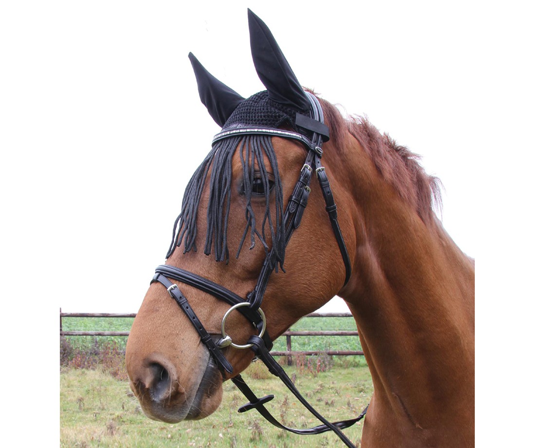 Skvělá kombinace čabraky a třásní. Účinně chrání oči i uši koně před obtížným hmyzem. Snadno se připevňuje pomocí suchého zipu na uzdečku nebo ohlávku.