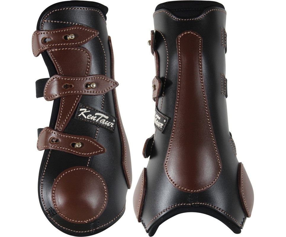 Přední skokové kožené chrániče od renomovaného českého výrobce KenTaur. Chrániče jsou vyrobené z kvalitní kůže, mají moderní, sportovní design, jsou tvarované a pohodlně sednou na koňskou nohu. Chrániče se zapínají na 3 háčky v kombinaci s elastickou gumou. V oblasti šlachy jsou zesílené dvojitou kůží pro větší ochranu. Vnitřek chraničů je měkce podložený neoprénem.