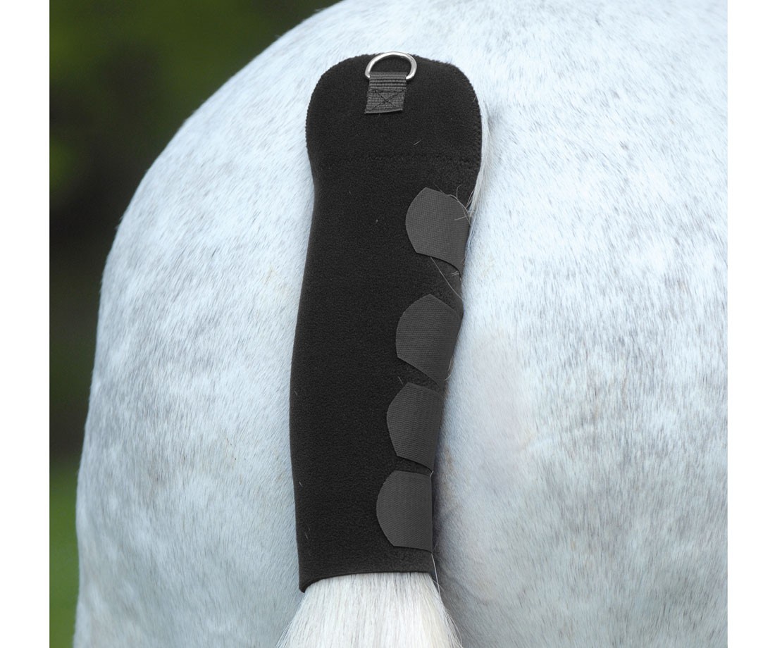 Chránič na ocas se zapínáním na suché zipy. Chránič je z vnitřní strany gumový, snadno omyvatelný. Má očko pro připevnění k transportní dece, aby se zabránilo jeho sklouznutí. Chrání ocas koně během transportu před otlačením nebo odřením od zadní rampy přepravníku.