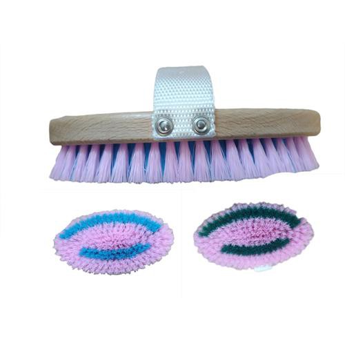 Zároveň působí jako masáž. Kartáč s umělým vlasem 2,5 cm, dřevěným tělem délky 18 cm a šířky 10 cm.