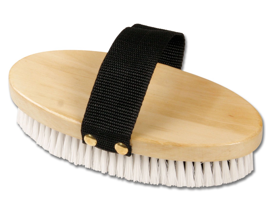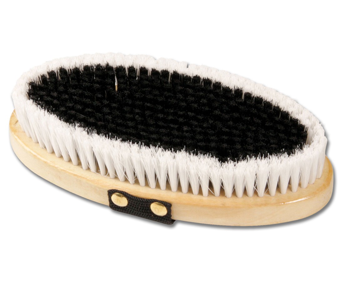 Měkký kartáč s poutkem. Směs tvrdších a jemnějších štětin. Dobrý na čištění celého koně.
