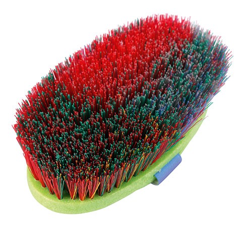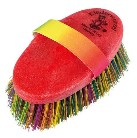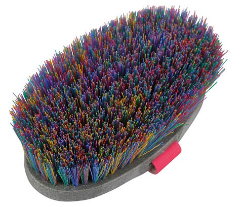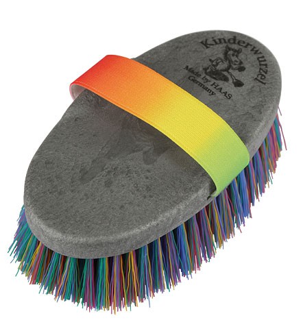 Kvalitní plastový kartáč na srst a hřívu se syntetickými štětinami v duhových barvách.