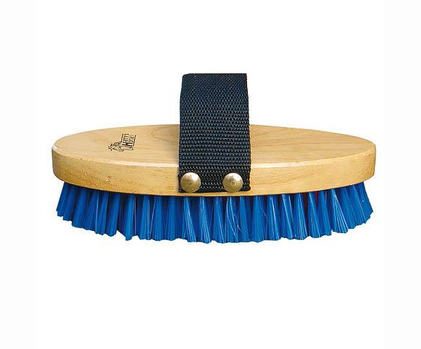 Jemný nylonový kartáč na odstraňování prachu ze srsti koně. Kartáč s dřevěným tělem délky 17 cm a šířky 7,5 cm, nylonovým poutkem a s umělím vlasem výšky 2,5 cm.