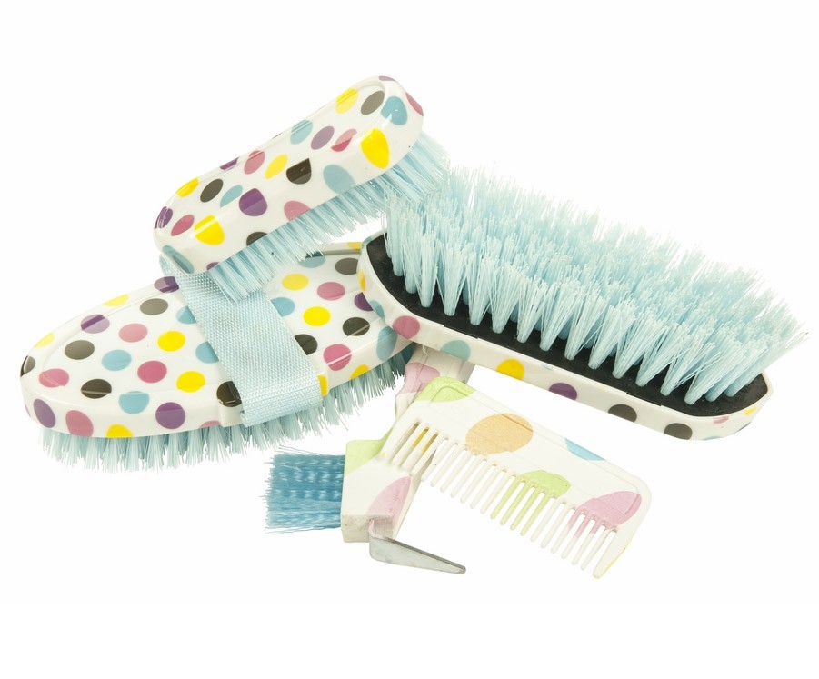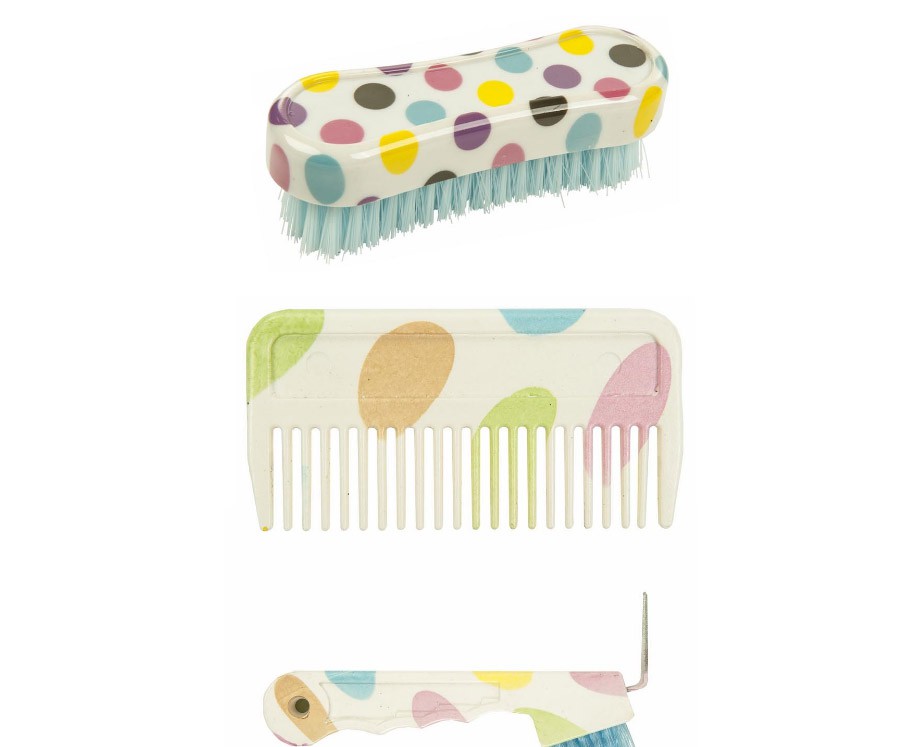 Sada čištění balená v plastovém obalu. Sada obsahuje kartáč na tělo, rýžový kartáč, hřebínek, háček na kopyta a kartáč na hlavu koně.