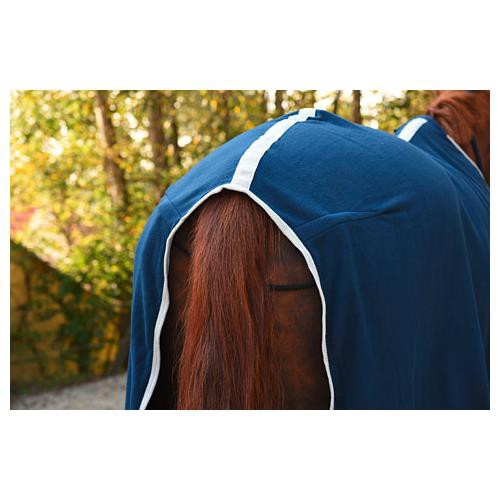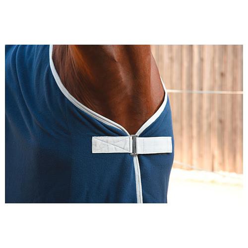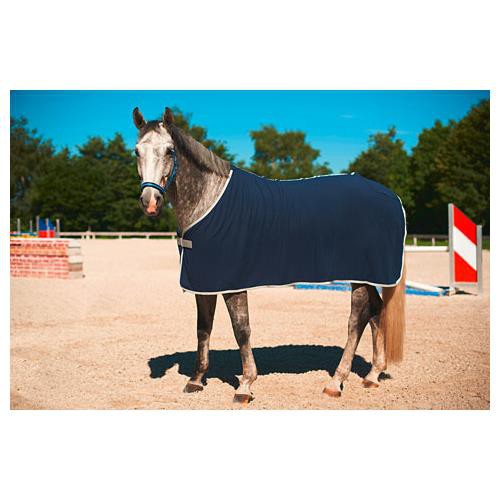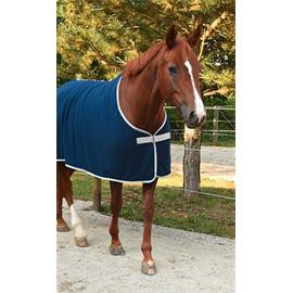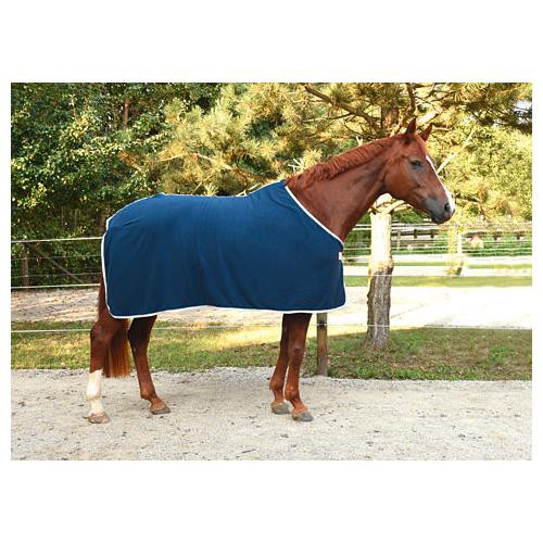 Lehká odpocovací deka z fleesového materiálu se zapínáním na přezku na prsou a podocasním páskem. Uprostřed na kohoutku zesílený fleece.Deka je velmi prodyšná, vhodná též i při transportu koně. Možno prát na 30 °C. Barva tmavě modrá se světle šedým lemováním.