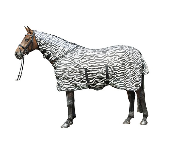 Praktická síťovaná deka s motivem zebry, který odpuzuje hmyz. Má nastavitelné zdvojené zapínání na hrudi, křížové zapínání a lacl pod břichem, dlouhé postranní díly, chránič ocasu a šňůrku pod ocasem. Výhodou deky je integrovaný, šířkově nastavitelný krční díl. Deka je snadno udržovatelná a má dobrý střih, který dobře sedí na koni i při dlouhodobém pobytu ve výběhu.
