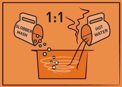 Odměrku Pavo Slobber Mash přelijte horkou vodou a přidejte ke krmné dávce.