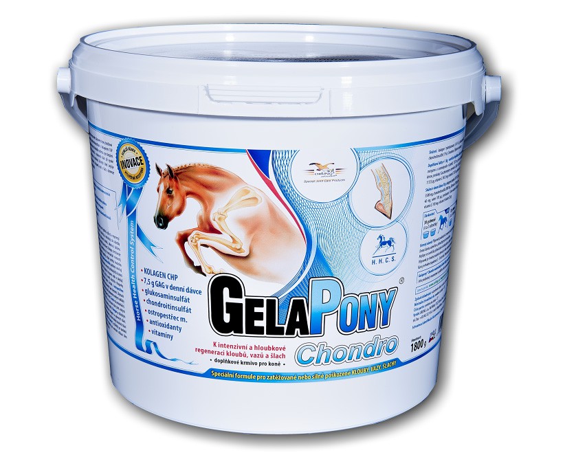 Doplňkové krmivo pro koně - komplexní perorální chondronutraceutikum s kolagenem CHP a glykosaminoglykany k intenzivní regeneraci kloubního systému a pro zlepšení elasticko-mechanických vlastností kloubních a vazivových tkání při vysoké sportovní zátěži. Díky vysoce efektivní kombinaci účinných látek zvyšuje Gelapony® Chondro elasticitu kloubních chrupavek, vazů a šlach, obnovuje pohyblivost a omezuje bolestivost kloubů.