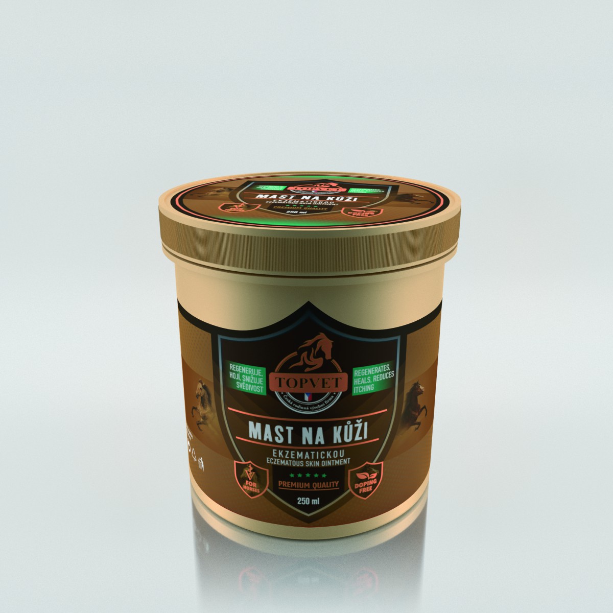 Mast na ekzematickou kůži je určena pro koně s kožními problémy. Originální receptura pokožku vyživuje, hydratuje a chrání před vnějším prostředím. Bylinná kompozice pokožku zvláčňuje, snižuje svědivost a obnovuje elasticitu. Je vhodná na rozškrábanou pokožku pro koně s letní vyrážkou. Mast vykazuje dlouhodobý účinek.