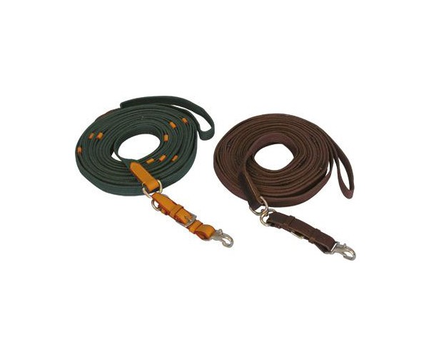 Bavlněná lonž s koženým koncem a koženými zarážkami proti prokluzování. Kožený konec je s lonží spojen obrtlíkem. Jednoduše vyměnitelná háčková karabina.