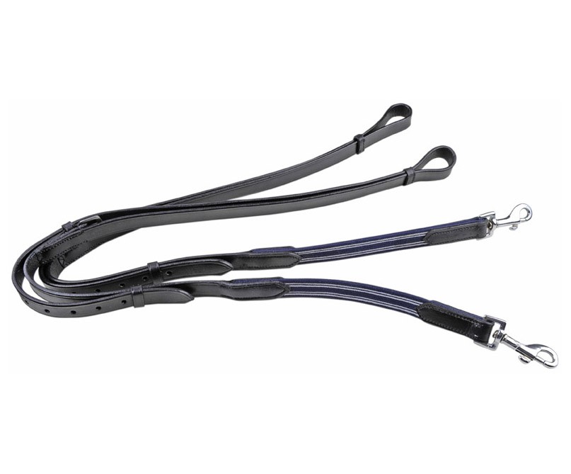 Kožené stavitelné vyvazovací otěže z kvalitní kůže s vsazeným elastickým dílem zakončené karabinami pro zapnutí do udidla a koženými poutky pro zapnutí do podbřišníku nebo např. madel. Kování stříbrné barvy.