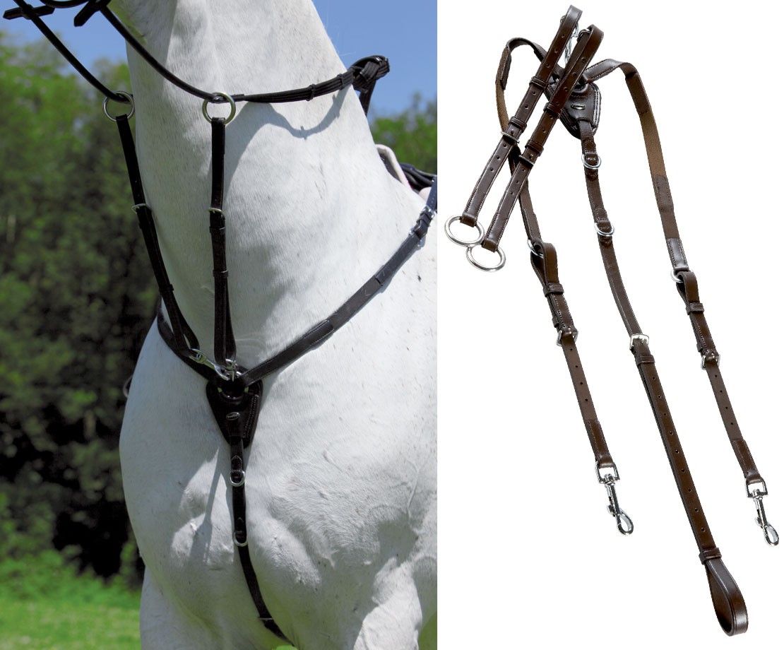 Velmi kvalitně provedený, měkce podložený poprsní řemen s martingaly a kroužky pro lepší variabilitu nastavení martingalu. Poprsní řemen Wembley je vyrobený z kvalitní a odolné kůže, je detailně ropracovaný. Na hrudníku je měkce polstrovaný. Velikost je nastavitelná. Martingalová vidlice i poprsní řemen se lehce upínají pomocí karabinek. Kování i přezky jsou nerezové.